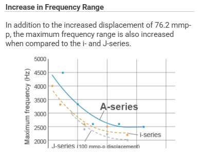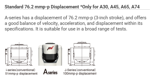 A series has a displacement of 76.2 mmp-p (3-inch stroke), and offers a good balance of velocity, acceleration, and displacement within its specifications. It is suitable for use in a broad range of tests.