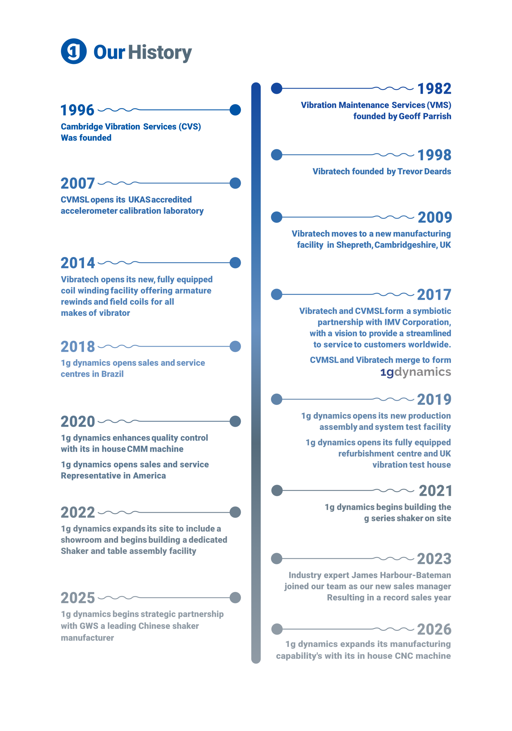 With roots stretching back to 1982 as Vibration Maintenance Services (VMS), 1g Dynamics has grown from a specialist service provider into one of the world’s leading names in vibration‑test support. The merger of Vibratech and Cambridge Vibration Maintenance Services (CVMS) in 2017 strengthened our engineering capability and broadened our global reach, setting the foundation for the modern 1g Dynamics you know today. In 2021, we proudly became part of the IMV Group, combining more than four decades of vibration expertise with the innovation and scale of a world‑class test‑technology leader.